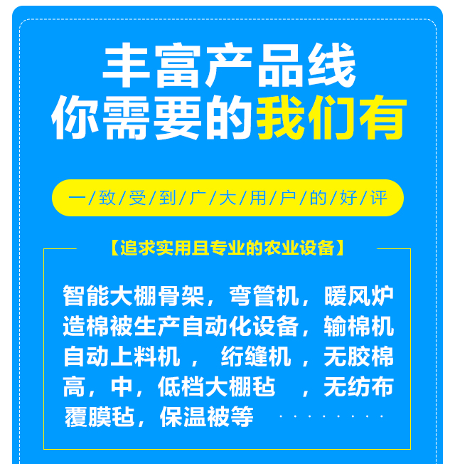 本公司設(shè)備齊全,可生產(chǎn)智能大棚骨架,彎管機(jī),暖風(fēng)爐等農(nóng)業(yè)設(shè)備,另制造棉被生產(chǎn)自動(dòng)化設(shè)備,自動(dòng)上料機(jī),輸棉機(jī),絎縫機(jī)等。質(zhì)量可靠,注重創(chuàng)新。公司擁有雄厚的實(shí)力,先進(jìn)的生產(chǎn)線,豐富的經(jīng)驗(yàn),可根據(jù)客戶(hù)的要求定做高,中,低檔大棚氈,無(wú)紡布,無(wú)膠棉,覆膜氈,保溫被等,車(chē)間日生產(chǎn)新型棉被10000平方米以上,能滿(mǎn)足各種客戶(hù)的需求,新型保溫被產(chǎn)品在國(guó)內(nèi)研發(fā)中始終保持在前列。